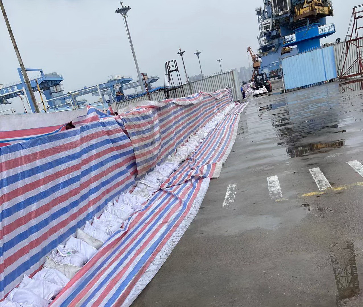 据悉,6月上中旬,西江上游和广东地区普降大雨,同时受到“龙舟水”、天文大潮的叠加影响,小榄港所处的小榄水道水位看涨。6月14日9:30时,水位达到警戒线,距离码头面只有1.2米。小榄港经营班子立即启动防洪应急预案,组织党员先锋队、团员青年突击队、各防洪小组分头落实防洪措施。警戒保卫组用彩飘圈定警戒范围,实施交通管制。供电设备控制组将码头14个接电箱抬高一米,防止水浸入电箱发生短路事故。防洪闸板装拆组兵分两路,在叉车的有机配合下,分段拼装了480米长的防洪钢板,构建“钢铁长城”防护港区。沙包填装组将储存在防洪沙池里的沙子装入编织袋,叠成堆后由叉车叉运至码头前沿。作业人员将帆布铺盖在钢板上,再在钢板两侧和顶端堆砌沙包加固。后勤保障组分发饮用水、凉茶,做好防洪人员物资保障。