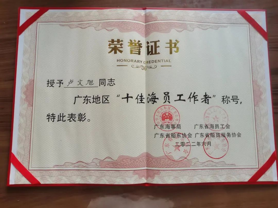 本次活动评选了广东地区“十佳海员”、“十佳海嫂”和“十佳海员工作者”,中山港航集团港澳分公司卢文旭荣获广东地区“十佳海员工作者”,在现场授予奖牌和证书。