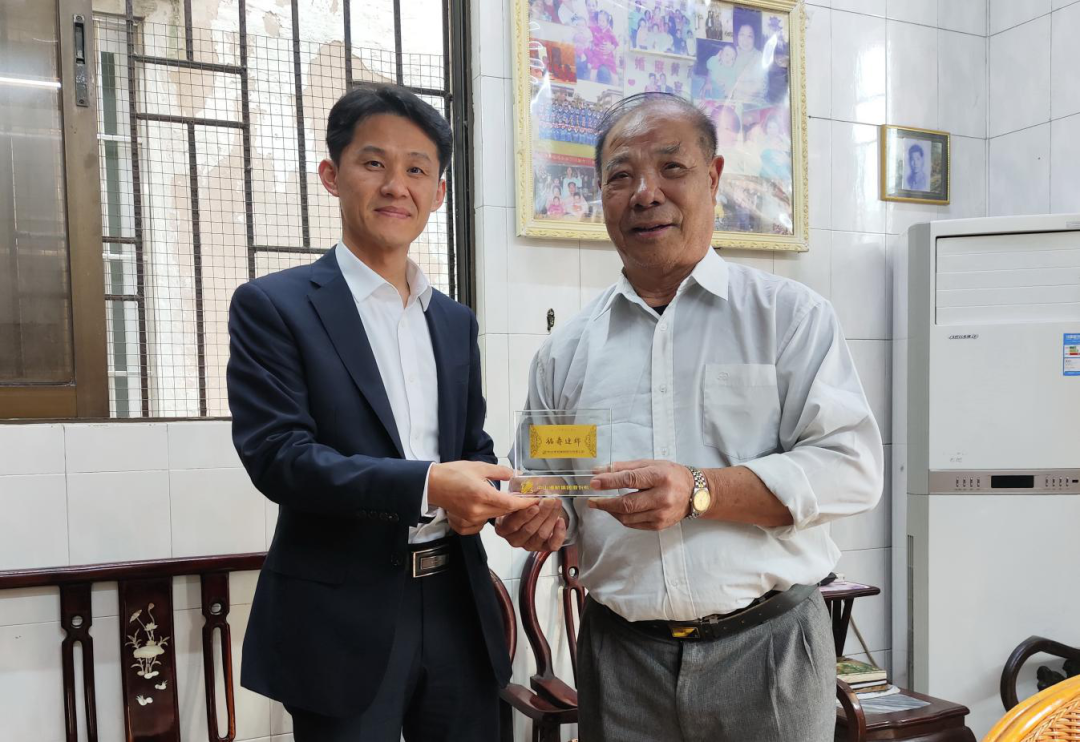 (董文泽为今年年满80周岁的退休职工代表送去纪念金牌)