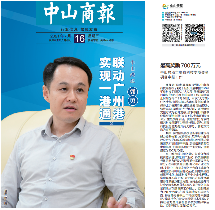 7月16日,中山商报【产经人物】栏目刊发专访文章:中山港航集团股份有限公司党委书记、董事长郭勇谈为中山“重振虎威”贡献港航力量。全文如下:
