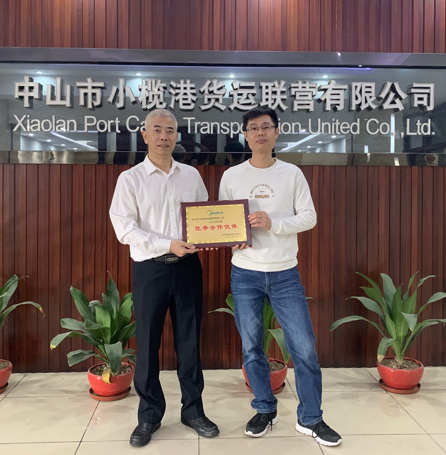 2月2日,美的集团常驻经理涂宏亮向小榄港赠送了一面“优秀合作伙伴”牌匾。小榄港总经理陈敏代表公司接受牌匾。涂宏亮经理称赞小榄港为美的货物出口业务提供了优质的服务工作和物流保障,对小榄港的工作给予充分肯定和感谢。
